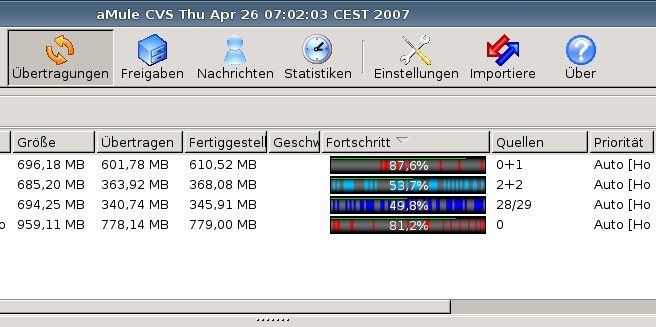 | Description | I have my download files sorted for the percentage of completness. But when I start amule monolithic svn-2007-04-26, the downloads are not sorted. I have to click two times on the column header to sort the files. See attached Screenshot that I took after just starting amule. | ||||||||||||