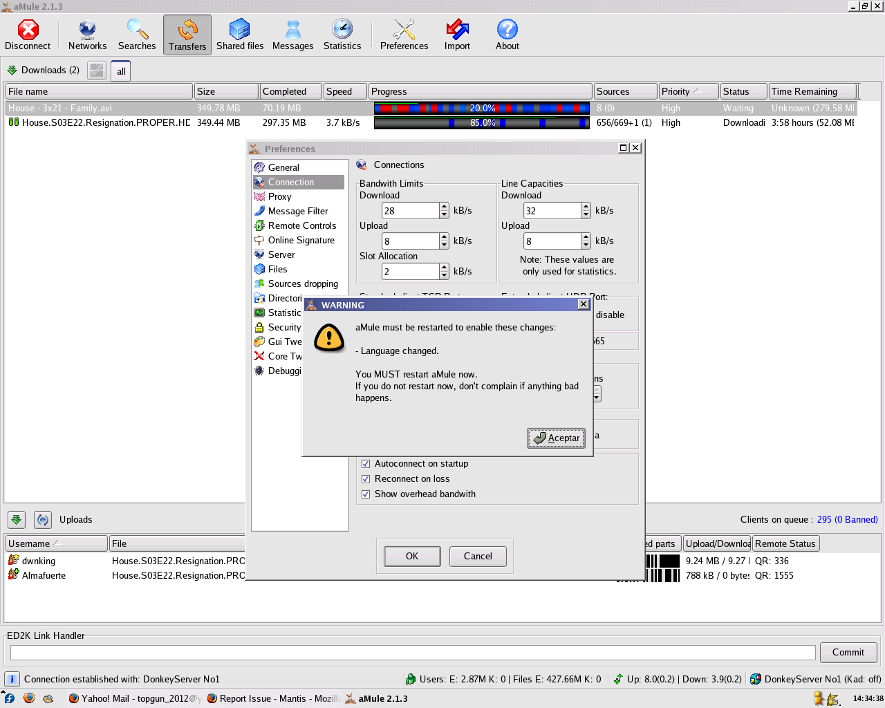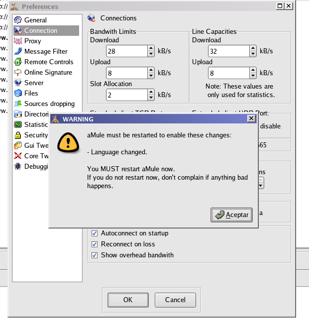 | Description | From time to time, when I update the connection capacity, or modify the Source Handling preferences, the language INVOLUNTARILY changes to Spanish, and when I go to click OK, even though the language is still set to U.S. English, it will say that aMule MUST be restarted because the Lanugage has changed, but it doesn't say what it has changed to. I only KNOW it's changed to Spanish, because the button that WOULD say "OK" says "Aceptar". |
