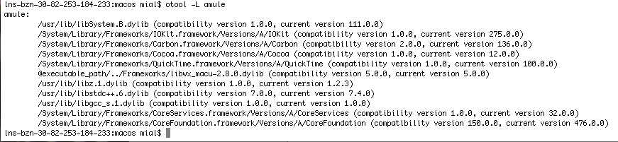 | Description | Can you tell me if, on the file, the line @executable_..... is correctly. Because when I would to share aMule with other personn, There is this message : Dyld Error Message: Library not loaded: /opt/local/lib/libjpeg.62.dylib Referenced from: /Users/newflesh/Downloads/aMule-CVS-20080318/aMule.app/Contents/MacOS/../Frameworks/libwx_macu-2.8.0.dylib Reason: image not found | ||||||||