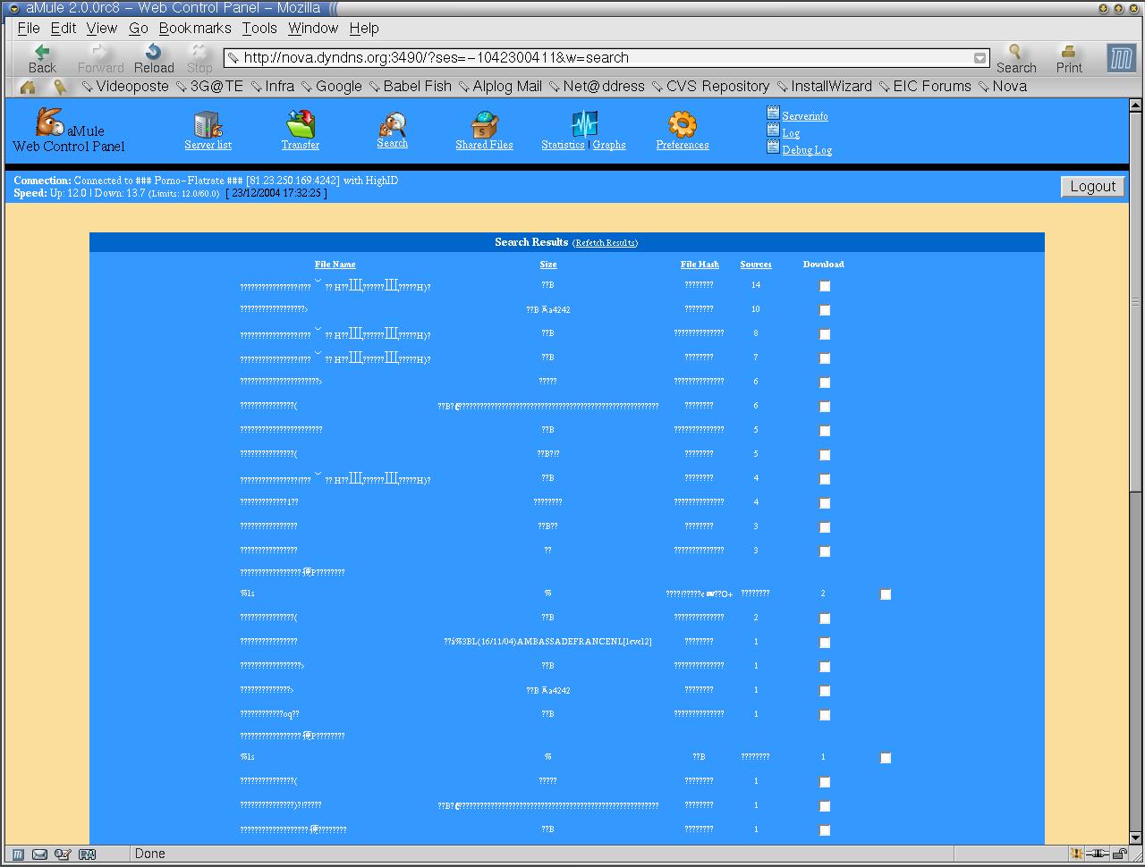 | Description | When doing a search in the web interface of aMule, I obtain results filled with weird characters and question marks. It smells like an unicode problem... I'm using the Mandrake 10.1 RPMs packages from your site (I was previously running aMule RC7 - ansi RPMs - without any problem). | ||||||||