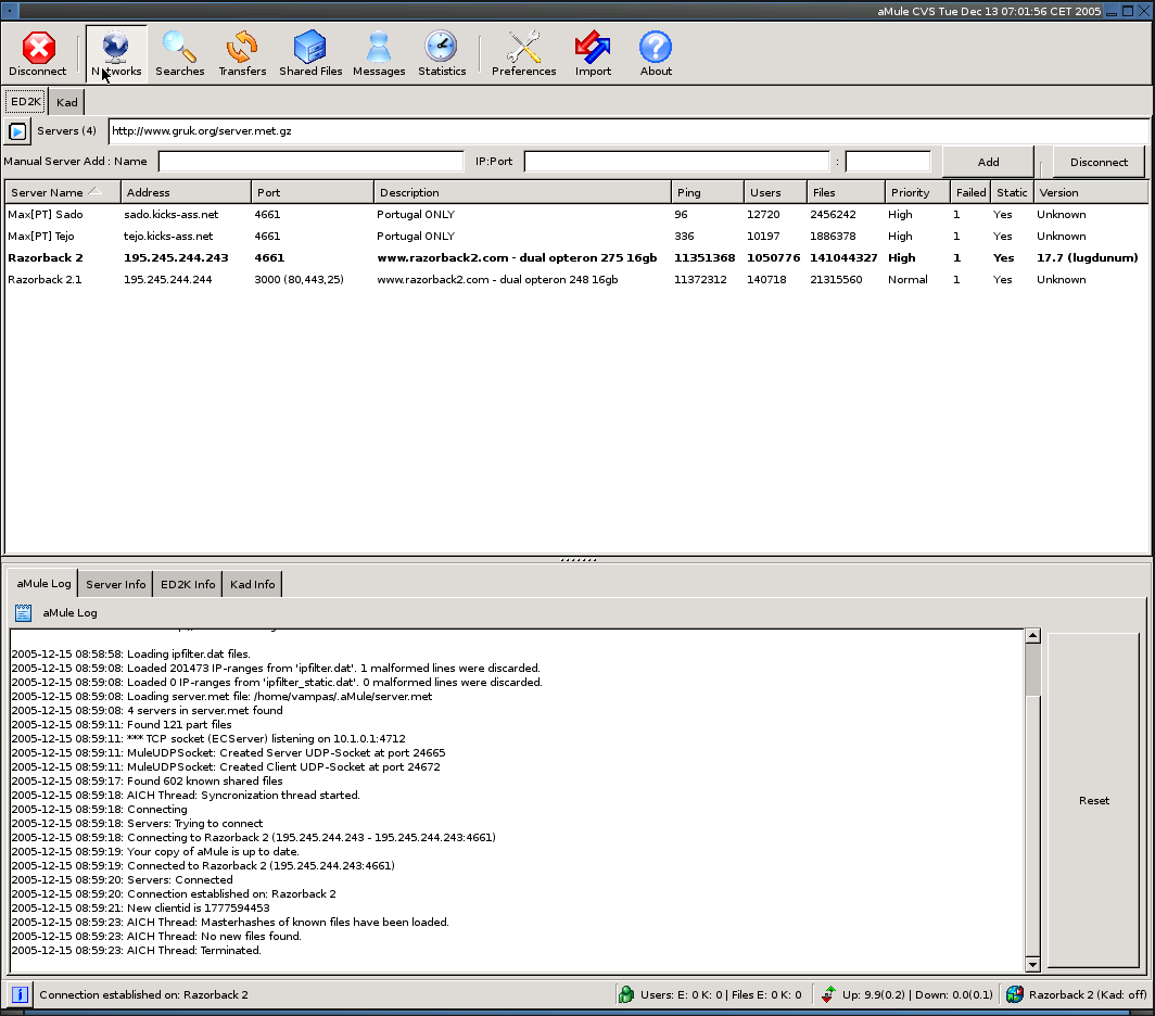 Kry, after our conversation, here's what I did: # date && sleep 12800 && date && /etc/init.d/vncserver start Thu Dec 15 05:25:35 WET 2005 Thu Dec 15 08:58:54 WET 2005 * Load config ... [ ok ] * Starting vncserver for user 'vampas' on localhost:0 ... New 'aMule' desktop is mail:0 Starting applications specified in /home/vampas/.vnc/xstartup And the attached screenshot was taken when aMule was running for ~8mins, and as talked, kad was off. Result: 1 failed attempt for all servers, and ping stats don't get updated. P.S: One thing I forgot to mention on #amule was that, with 2.0.3, the ping stats get updated. |