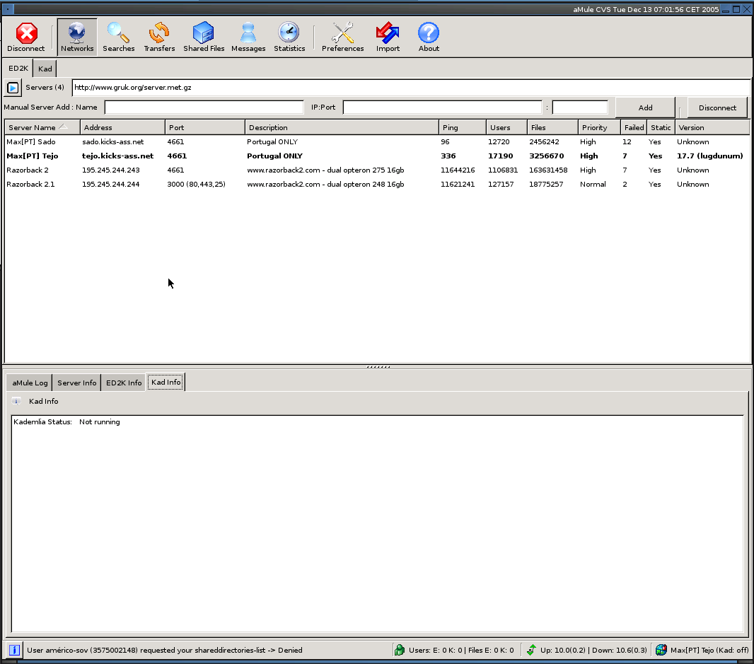 If you see bug 0000723, you notice the source of the bug(Natural Stupidity), ie, I hadn't passed --enable/disable-kad-compile. Right now, I passed --enable-kad-compile, so part of my above notes kinda got solved, ie, when starting amule, it starts with kad firewalled and after some time, kad becomes ok. But, and there's always a but, after running for about 5 hours, I went to check on aMule, I had 2 failed attempts for each fo the servers(4) on my server list, and kad was firewalled. I tried reconecting to a server, and kad, after some time did got ok again. Is this the normal behaviour? P.S: This note was based on the 12th Dec Snapshot. edited on: 12-13-05 13:56 |