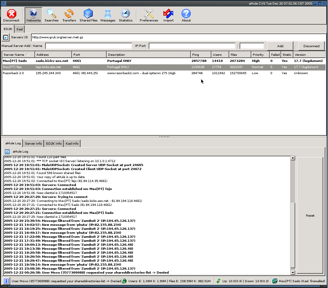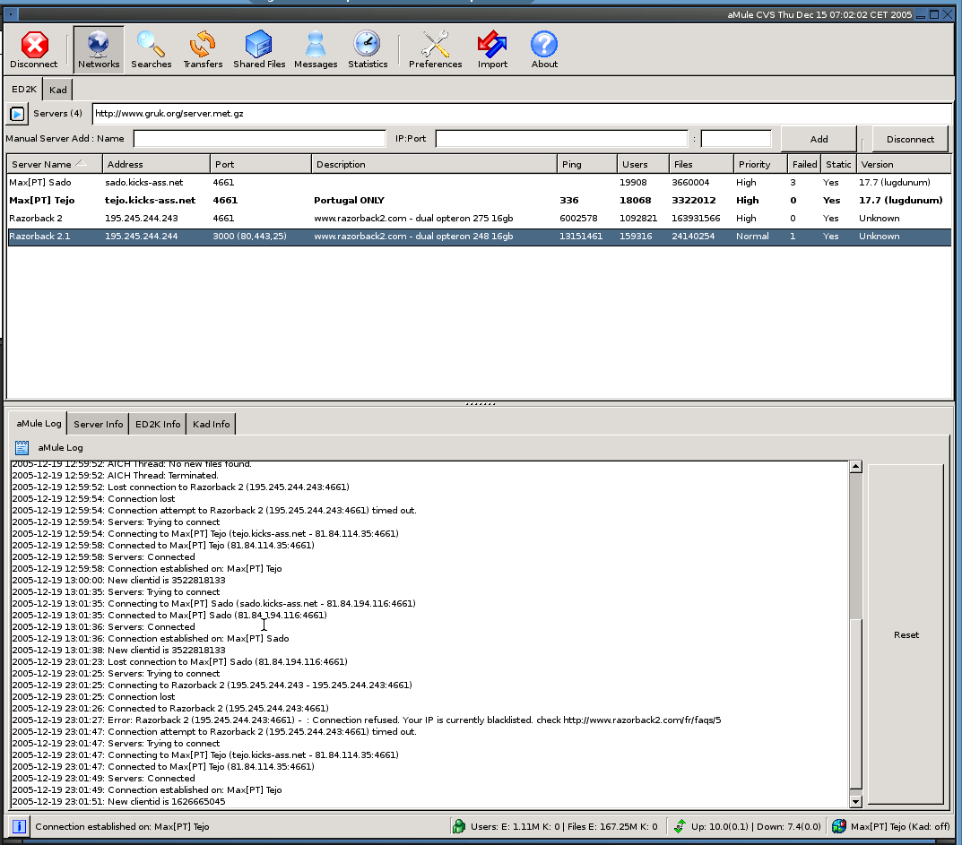 After talking to soundt3ch about this matter on IRC I saw that my pings on the server page are quite high for some servers, I'm talking about 5-7 figure numbers here. I'll recheck tomorrow to see if they are being updated. While the ping for Razorback2 (as an example) is a 7 figure number, I'm able to connect to it, High ID, Kad OK, and the regular console ping gives me an average round trip time of about 100ms. dude@server / $ amule --version aMule CVS using wxGTK1 v2.6.2 (Debugging) (Snapshot: rev. 6157) (OS: Linux) |
